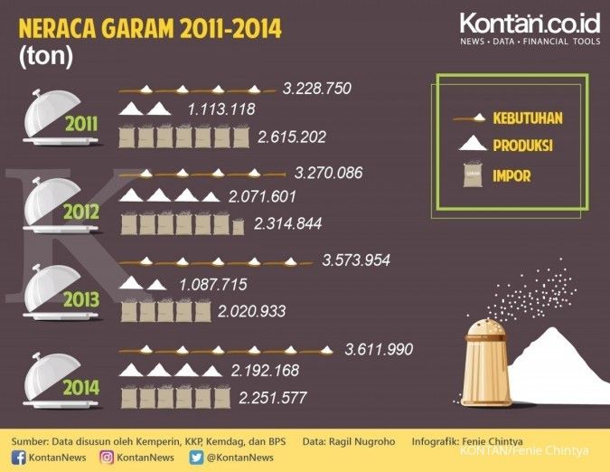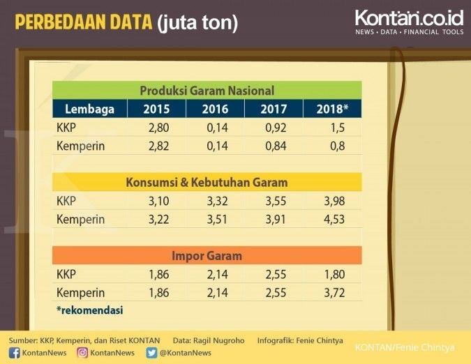 Apalagi, data tentang garam juga simpang siur. Kementerian Kelautan dan Perikanan (KKP) dan Kementerian Perindustrian (Kemperin) memiliki data yang berbeda, baik tentang produksi maupun kebutuhan garam nasional. Alhasil, mereka pun merekomendasikan angka impor garam yang berbeda pula untuk tahun ini. Kemperin mengajukan 3,7 juta ton garam impor, sedangkan KKP hanya 1,8 juta ton.